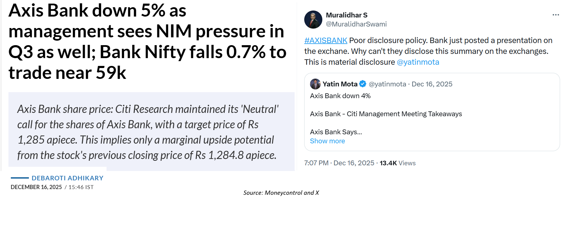 That the information shared by Axis Bank at the December 15, 2025 meeting with select institutional investors was material and price sensitive was borne out by media reports citing the Citibank research report and the stock price performance of Axis Bank versus the major indices on December 16, 2025. What is equally surprising is that despite all this information being in the media, nobody (notable exception of Muralidhar S on social media) has made an issue of the fact that a prominent bank shared such information to select institutional investors. Worse, even after these media reports, Axis Bank did not feel the need to disclose to the stock exchanges the transcript of the discussions it had with these institutional investors. Even this analyst’s request to the bank to publicly release the information fell on deaf ears.