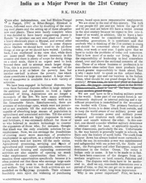 We are and have to be a leading military power in the world. Some part of our armed forces is unfortunately deployed in internal policing and a significant proportion is immobilised in the mountainous border with China. The primary function of the armed forces is to deter attack from outside, and to keep the world aware of our military power and potential. Economic power and military power safeguard and reinforce each other: one is inadequate and unsafe without the other. In this context, one should consider whether military deterrence is relevant only for land, or applicable equally to other dimensions, particularly the sea. Unfortunately, the way history is generally taught in schools, we learn only the history of north India. The south from Gujarat down has always looked more outwards towards the sea; its economic power was supplemented and safeguarded with sea power till, the Arabs and later, the Portuguese and other Europeans, acquired dominance in the Indian Ocean. The ocean is Indian only in name. It has to be made so in fact. We have been conscious of the dangers from immediate neighbours on land, namely, Pakistan and China. The disputes with them have to be moderated to, shall we say, reasonable dimensions over a period of time, so that we can get on to more generalised objectives of wider, long-term importance. Why is sea power important?   First, we have a long sea coast and at least two chains of islands which jut out into the wide ocean, around which no littoral territory has the capability for policing, leave aside deterrence. Second, the ocean lies between the Atlantic, Pacific and Antarctic: it is too strategic to be ignored by either super power or any other power that wishes to matter in the vicinity; if USA and USSR were to leave it alone, Japan or China might step in or Indonesia might assert itself over Andamans and Nicobar. Third, land power gives command over a relatively limited area in the neighbourhood and, being territorial, can arouse passionate opposition; sea power concerns a much wider area of influence without territorial acquisition, over which trade or movement can also be protected. Among other things, the movement of petroleum can be secured or denied, and one is not constrained by contiguity. All these considerations do not, of course, mean that land power can or should be neglected. One argument raised in this connection is: against whom is the sea power aimed at? Our land power is obviously aimed at the deterrence of China and Pakistan. Now sea power does not have such obvious direct aims. But it can, for instance, provide timely succour to a friendly Vietnam or Mauritius and underwrite our credibility for delivery of support to potential friends.