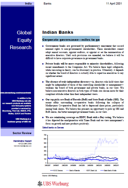 Compliance with the formal corporate governance code will be incorporated in FY2001 annual reports. investors should not be dismayed by the lack of a corporate governance structure or conversely, lower their guard at elaborate corporate governance norms. Our report reveals that substance (eg, the importance of truly independent directors) is more important than form (compliance with the corporate governance code).