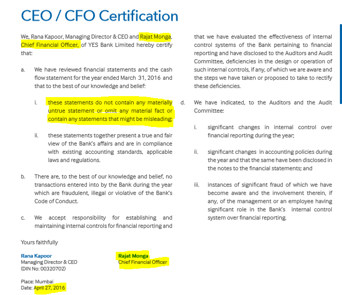The CEO and CFO even provided an impressive certification of conforming to Yes Bank’s Code of Conduct and Ethics.
