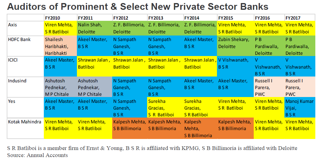 An analysis of six prominent private sector banks; Axis, HDFC Bank, ICICI, Indusind, Kotak Mahindra and Yes reveals that with the exception of HDFC Bank and Indusind in the last 8 years, the banks have repeated not only the same audit firm but also the same partner (barring ICICI Bank). Viren H. Mehta, partner, S.R. Batliboi, a member firm of Ernst & Young has been repeated as auditor at Axis Bank and at Kotak Mahindra Bank. More importantly, he was the auditor in FY2016 at Yes Bank where the gross NPA divergence was 558% and at Axis Bank where the NPA divergence was 156%. Collectively in the two banks he overlooked gross NPAs of an astounding Rs 137 bn (around US$ 2.1 bn). In India, NPA identification is rule-based and there is limited space for misinterpretation for asset classification.