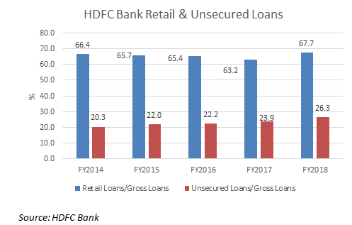 For HDFC Bank, even though the NIM remained constant, the composition of loans changed as retail loans rose. But more importantly, the bank took on higher risk: unsecured loans rose from 20.3% of gross loans in FY2014 to 26.3% of gross loans by FY2018. The bank’s unsecured loans mainly consist of retail and credit card loans.
