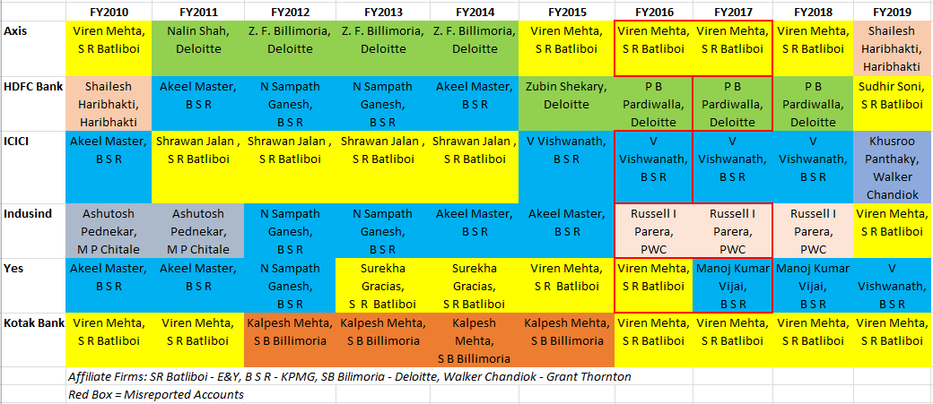 EXECUTIVE SUMMARY. In a stunning rebuke to audit firm S.R. Batliboi (SRB), a member firm of Ernst & Young, the Reserve Bank of India (RBI) barred the firm from taking any bank audit for 1 year commencing from April 1, 2019. The public humiliation of a leading audit firm for “lapses” in a bank audit also highlights SRB’s dominance of private sector bank audits and the pivotal role of its partner, Viren H. Mehta, in certifying accounts which the regulator subsequently found to be misleading. Despite SRB and its partner scoring a hat-trick by certifying 3 years of fudged accounts in Axis (FY2016 & FY2017) and Yes Bank (FY2016), prominent private sector banks such as HDFC Bank, Indusind Bank and Kotak Mahindra Bank not only appointed/continued with SRB as their auditor, but the latter two banks had Viren H. Mehta to sign off on their accounts. The unflinching faith in a Big 4 auditor by prominent banks owned by marquee institutional investors, despite regulatory disclosures exposing the poor quality of audit done by SRB, once again demonstrates the abysmally poor standards of corporate governance practised by the board of directors and institutional shareholders in private sector banks. If it had not been for the banking regulator barring SRB, these private sector banks would have continued to reward a disgraced audit firm with their audits just as they did when they reappointed Shikha Sharma and Rana Kapoor at Axis and Yes Bank for another term as CEOs, only to have the RBI disallow it.