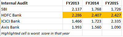 EXECUTIVE SUMMARY. Recently, the Reserve Bank of India (RBI) was forced to disclose its confidential inspection reports, called Risk Assessment Reports (RARs), of the State Bank of India (SBI), HDFC Bank, ICICI Bank and Axis Bank for the years FY2013 to FY2015. Shockingly, among the four banks, HDFC Bank was assessed not only with poor scores on internal audit, operational (non-IT) risk, risk governance, senior management and board risk, but with the worst scores on internal audit in all 3 years, and in non-IT operational risk in 2 of the 3 years. This stands in contrast to HDFC Bank’s reputation for good governance. Although, on the aggregate risk, there was no cause for concern, the fact that RBI scored HDFC Bank as high-risk on these select segments, and that from FY2013 to FY2015 these segment risk scores kept getting worse, should be of concern to shareholders. It is worth recalling that in July 2011, Cobrapost had exposed the staff of banks brazenly marketing money laundering; HDFC Bank figured prominently among these, and was subsequently fined by the RBI. Apparently, the bank and its board took the regulator’s penalty lightly, as its subsequent RBI risk scores evidenced a casual approach towards internal audit and compliance.