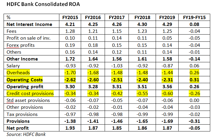 EXECUTIVE SUMMARY. On the eve of HDFC Bank’s 2QFY2020 results (October 19, 2019), an analysis of its profitability for the last 5 years reveals that, while its ROA marginally declined as credit costs increased, it was the leveraging of operating costs which compensated to maintain the bank’s excellent profitability. It appears that the bank has been able to successfully generate higher business through re-engineering its processes, and its digital strategy has contributed to this achievement. The bank has been able to sweat its labour force and existing infrastructure to achieve higher business. The critical issue remains whether the bank can continue with this strategy of leveraging its operating cost in the future. In the current faltering economy, the bank is unlikely to increase its net interest margin and its fees to compensate for the expected higher credit costs and if it is unable to continue with its earlier strategy, shareholders should expect a decline in its profitability.