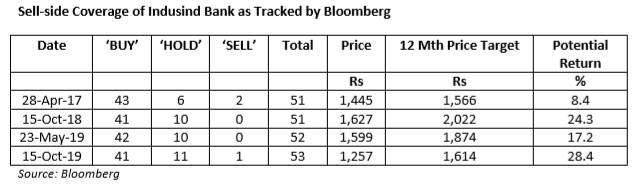EXECUTIVE SUMMARY. Indusind Bank, once a hot favourite of the market and of institutional investors, is fast losing its lustre. It has fallen by around 21% in the past year, and lost around US$ 1.4 bn for shareholders.  But right through this decline, while the market had concerns on asset quality, the overwhelming majority of the 53 sell-side analysts continued to repose faith in the bank and its senior management by steadfastly maintaining their bullish view on the bank. This is despite the bank reporting significantly higher credit costs than the sell-side estimates, compelling them to increase their credit cost estimates for FY20 and FY21E and reduce their 12 month target price on Indusind Bank. Neither the sharp deterioration in asset quality, nor the downgrading of estimates, nor the fall in the share price, nor the opacity in CEO succession has deterred the loyalty of the sell-side to the bank. The safety of the herd ensures that there will be no accountability when bullish calls go horribly wrong. The continued sell-side devotion to Indusind Bank may result in a sour and not so happily-ever-after ending for the bank’s shareholders.