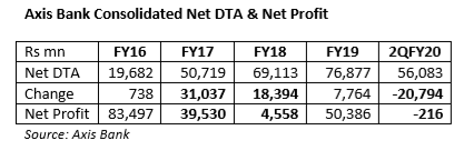 EXECUTIVE SUMMARY. The market ignored Axis Bank’s consolidated net loss of Rs 216 mn in 2QFY2020. Though sell-side analysts were not expecting this result, they nevertheless bought the bank’s explanation that this was “one-time” in this “quarter of transition”, as deferred tax assets (DTA), which are intangible assets, were restated to take advantage of the lower corporate tax regime. Axis’s result presentation kept emphasising the figure of profit adjusted for DTA. What the market has deliberately chosen to ignore is that
