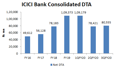 EXECUTIVE SUMMARY. Although ICICI Bank reported a strong performance in 3QFY20, the market has ignored the increase in the deferred tax asset (DTA) which inflated the net profit by Rs 2 bn. It would have been more prudent for the bank to continue with its earlier practice in 1QFY20 and 2QFY20 in reducing the DTA. The bank has an outstanding consolidated DTA of Rs 80.6 bn (as compared with 9 months ended December 31, 2019 consolidated net profits of Rs 83.1 bn) which eventually at some future date will have to be reversed and charged to profits. A positive feature in ICICI Bank is that it discloses the DTA figure in its quarterly results, unlike other prominent banks, and hence analysts can regularly track it, but as usual nobody chooses to analyse or comment on its implications.