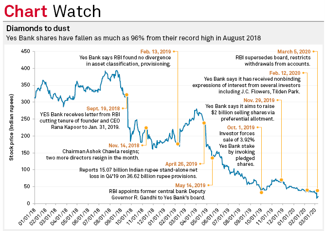 As of last week, Yes Bank’s share price had declined as much as 96% from its record high of 394 rupees on Aug. 20, 2018. Once the country’s fifth-biggest private lender by assets, it has undergone a gradual deterioration of its financial position, due to its inability to raise capital to buffer against potential loan losses. Meanwhile, credit ratings downgrades had triggered invocation of bond covenants by investors and withdrawal of deposits, the Reserve Bank of India said in its March 5 statement.