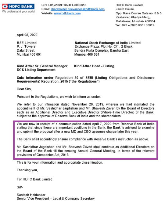 On April 9, 2020, this analyst, who is also a shareholder of HDFC Bank sent a query to the bank asking how the bank could continue to retain both the individuals as Additional Directors when the RBI had explicitly disapproved of their appointment at the current stage. HDFC Bank declined to respond to my query but on April 18, informed the stock exchanges that Jagdishan and Zaveri had resigned as directors and the board had accepted their resignation.