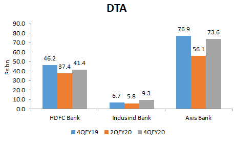 EXECUTIVE SUMMARY. In the case of all the three prominent private sector banks (HDFC Bank, Indusind Bank and Axis Bank) that have declared 4QFY2020 results, sell-side analysts and the business media have chosen to ignore the role of deferred tax assets (DTA) in inflating 2HFY2020 net profits. Even though AS-22 treats DTA as a short term intangible asset, it is not prudent accounting to create, or keep increasing, DTA. Shockingly, in the analyst conference calls for all three banks, not a single question was posed on DTA and the inflation in net profits, or regarding how the banks will have to reverse this intangible asset in the near future, depressing earnings in those (future) years. Either the sell-side does not comprehend DTA, or, since the majority of them are positive on these banks, they do not want to factor in the reversal of DTA, which would depress their future estimates and price targets.