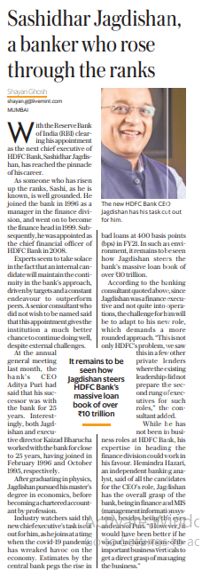 MUMBAI : With the Reserve Bank of India (RBI) clearing his appointment as the next chief executive of HDFC Bank, Sashidhar Jagdishan, has reached the pinnacle of his career.