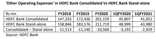 EXECUTIVE SUMMARY. In comparing a company’s stand-alone expenses with its consolidated accounts, it is highly unusual for the consolidated numbers to be lower than the stand-alone numbers. But what has gone unnoticed for some years in HDFC Bank is that its stand-alone ‘other operating expenses’ has been consistently higher than the reported equivalent in the consolidated accounts. Even though India’s most valuable bank is covered by 50+ sell-side analysts who minutely examine the financials, and by a large tribe of business journalists, this particular aspect has been overlooked. The anomaly is explained by the significant payments HDFC Bank stand-alone gives to its non-bank finance subsidiary, HDB Financial Services (HDB FS), which also provides business process outsouring (BPO) for the retail operations of the bank. These expenses get eliminated in the consolidated accounts.