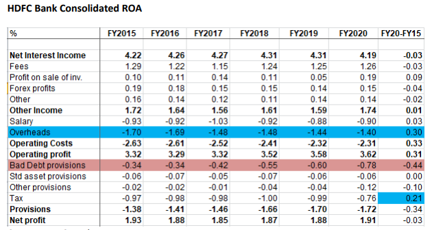 EXECUTIVE SUMMARY. A 6-year profitability analysis of HDFC Bank, India’s most valuable bank, reveals that it has been able to maintain it ROA despite a surge in credit cost for three reasons. Firstly, it has leveraged its overheads to generate more business for the bank, secondly, the lower tax rate in FY2020 and finally the domestic treasury profits also contributed to stabilising its profitability. Both the lower tax rate and treasury profits are not sustainable in the future. As compared with ICICI Bank and Axis Bank, HDFC Bank has superior cost-to-income (excluding domestic treasury profits) ratios. Despite having a large employee base, the new private sector banks have successfully deterred the formation of labour unions, which weakens the negotiating power of labour, and HDFC Bank has also benefitted from this situation.