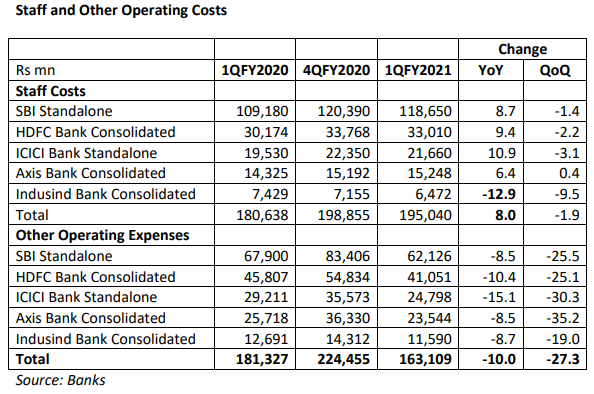 As compared with government banks, private sector banks have a higher component of non-staff costs to staff costs, on account of the incentives they pay to direct sales agents (DSAs) and for business processing outsourcing (BPO); for government banks such work is done by their own staff. In the 1QFY2021 it would appear that banks have commenced cost cutting measures, as they reported a decline in non-staff operating expenses. However, management commentary claimed that this was on account of the loss in business, which resulted in lower expenses related to the business, such as sourcing fees and commissions to direct sales agents (DSA). But nevertheless the banks in our sample, with the exception of Indusind Bank, reported improvements in the cost-to-income (excluding domestic treasury profits) ratio.
