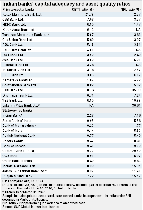 The country’s private-sector banks, including YES Bank Ltd., ICICI Bank Ltd. and Axis Bank Ltd., have raised more than 700 billion rupees in share sales since Jan. 1, according to S&P Global Market Intelligence data, compared with share sales by two state banks totaling nearly 16 billion rupees. Except for Yes Bank and Lakshmi Vilas Bank Ltd., all private lenders reported common equity Tier 1 ratios higher than 10% as of June 30, and more than half of them had nonperforming loan ratios of below 5%. In contrast, most state-run banks reported CET1 ratios of below 10%, and all of them posted NPL ratios of more than 5%.