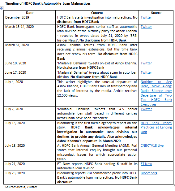 EXECUTIVE SUMMARY. US law firms, Rosen Legal, Pomerantz and Schall have filed class action suits (here, here and here) against HDFC Bank. The grounds are that HDFC Bank allegedly misled investors, provided inadequate disclosures and internal controls over financial reporting, and engaged in improper lending practices in its automobile loan division, resulting in a lack of credibility of its public statements. On Twitter, and subsequently in the media, there has been a consistent barrage of information on the improper practices in its automobile loan division. HDFC Bank has officially said that certain errant individuals in the automobile loan division were held to account, but has not publicly acknowledged the role of Ashok Khanna, the former head of the division. Khanna not only reported directly to CEO Aditya Puri, but was also given repeated extensions by the board of directors after his retirement. If Khanna is found to have been involved in the malpractices, it may also expose Aditya Puri to vicarious liability.