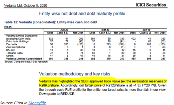 EXECUTIVE SUMMARY. On the opening date of Vedanta’s delisting offer (October 5, 2020), ICICI Securities (I-Sec) issued a results research note on Vedanta with the following bizarre statement: “Vedanta has highlighted the SEBI [The Securities and Exchange Board of India] approved book value (ex the revaluation reserves) of Rs 89.3/share.” I-Sec, a listed subsidiary of ICICI Bank, is an investment bank and sell-side firm. The report was authored by Abhijit Mitra (with 8 1/2 years sell-side experience) and Udaykiran Paluri. Even a novice analyst would know that a company’s accounts are certified by the auditor, and the capital market regulator has no role to approve or disapprove a company’s book value.