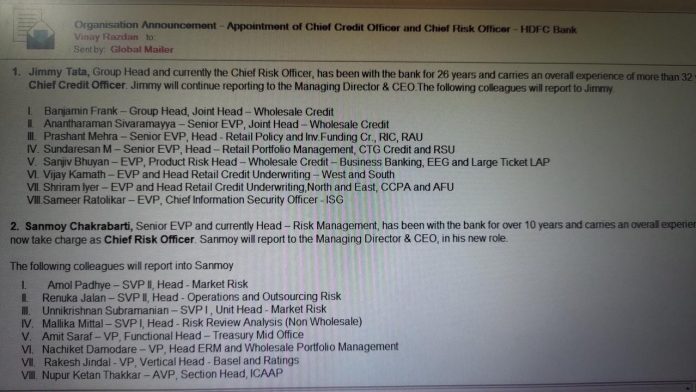 EXECUTIVE SUMMARY. Nearly a year after Axis Bank truncated the responsibilities of its Chief Risk Officer (CRO) by transferring corporate credit risk to the role of the newly created Chief Credit Officer (CCO) who reported only to the CEO, HDFC Bank has decided to go a step further. It has transferred corporate and retail credit risk to a similarly newly created role of a CCO (no business targets), who will report only to the CEO, and transferred the earlier CRO to the CCO post. HDFC Bank also shifted individuals in the CRO handling credit risk to the CCO, and made the latter accountable for credit decisions. The rationale provided by HDFC Bank is that in its future credit expansion it wants greater underwriting focus and accountability and therefore wants an experienced individual to accept responsibility for the CCO post who will report to the CEO.