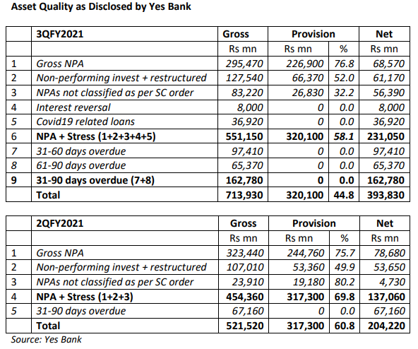 EXECUTIVE SUMMARY. A commendable feature in Yes Bank’s 3QFY2021 results declared on January 22, 2021 was the continued level of transparency made available to investors on its asset quality, despite reporting the inevitable huge increase in stress loans. Around 30% of private sector banks loans were under the Covid-19-induced moratorium, 3QFY2021 is the first quarter in which the impact of the lockdown on asset quality will be visible. Yes Bank not only provided a detailed breakdown of its non-performing and stressed assets and the provisions made against them, but also reported its exposures not classified as non-performing on account of the Supreme Court order. Most importantly, it also continued to disclose its 30-60 days and 61-90 days overdue loans (first disclosed in 3QFY2020 presentation), and the capital market can take its call on providing estimates on the additional provisioning required.
