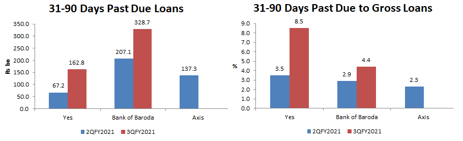 It is commendable that banks like Yes Bank and Bank of Baroda (BOB), which reported 3QFY2021 results on January 27, voluntarily disclosed the 30+ days past due loans in their analyst presentation, despite the number revealing a significant deterioration in asset quality as compared with 2QFY2021. The equity market severely punished their share prices on January 28, with Yes Bank falling by 4% and BOB by 10% on January 28.