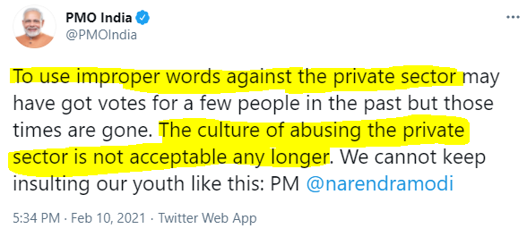 The Indian prime minister’s statement in parliament that “improper words against the private sector…[and] the culture of abusing the private sector” may not be tolerated indicates that the government now aims to bring about a major change in the political culture of India. Indeed, just as various dissidents, protesters and even comedians have been charged with serious offences against the state, it is possible that those alleging private corporate firms with corruption may face similar charges. This is intended to carry through unpopular reform measures with a minimum of opposition.
