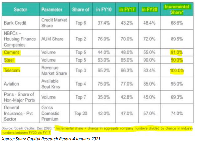 EXECUTIVE SUMMARY. In the last 3 years, studies have revealed the unprecedented acceleration and concentration of profits and economic power accruing at the pinnacle of corporate India. The large corporates have become bigger and the small corporates have fallen further behind. This has happened not only on account of superior entrepreneurship but also as a result of conscious state policy. In theory, a state committed to a free market intervenes to break up monopolies and at least regulate oligopolies to prevent them engaging in anti-competitive practices, but in India the state has actively worked to increase the dominance of large corporates.
