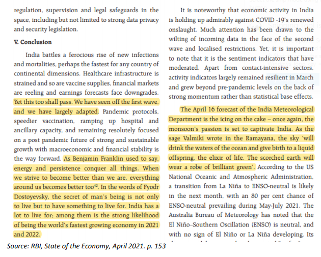EXECUTIVE SUMMARY. Documents of the Reserve Bank of India (RBI), like those of most central banks, are usually dry, sober statements of fact and analysis. Thus readers of the RBI’s April 2021 State of the Economy document would have sat up and rubbed their eyes as they read its call for a “celebration of life” during the present Covid-19 crisis:
