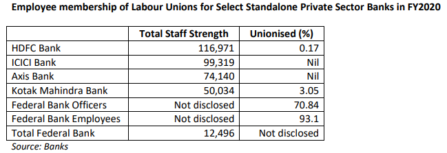 For the new private sector banking (established post 1991) and financial intermediaries, this data will reveal the near absence of trade unionism amongst their employees, and the high turnover of staff, especially at the lower levels. This turnover at the branches engaged in retail banking appears to be on account of ambitious sales targets set by the management. Such issues have typically been ignored by institutional investors, and indeed they often applaud such a policy, as it restrict wages and delivers higher profits.
