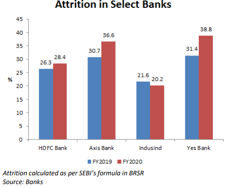 EXECUTIVE SUMMARY. While Axis Bank has recovered from its corporate non-performing asset (NPA) crisis, it seems to be in the midst of a management attrition problem, partly explained by significant sackings in FY2020. Staff turnover levels have been steadily rising in the period FY2018 – FY2020 (FY2021 data is not yet released). What is worrying is the attrition is across management strata, and covering all age groups. In our sample of banks (HDFC Bank, Axis Bank, Indusind Bank and Yes Bank) which disclose this data, only Yes Bank has worse attrition than Axis Bank, which is understandable given Yes Bank’s precarious situation till FY2020.