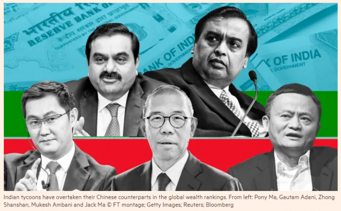 India’s industrial moguls Mukesh Ambani and Gautam Adani have swept past the likes of China’s Jack Ma in global wealth rankings as the fortunes of leading billionaires in two of Asia’s largest economies diverge.