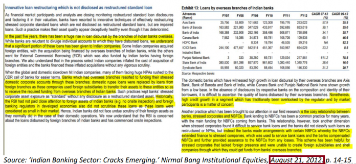The purpose of lending in foreign exchange to a foreign subsidiary of a domestic company, and layering the transactions through various companies, was to confuse auditors and regulators, and to hide the objective of the end-use of the loans. The brazenness of these transactions (transferring the funds to other companies within the same day or in a few days) and the possible violation of the Reserve Bank of India (RBI) norms for the end-use of external commercial borrowings indicate that these banks believed the regulators would not catch them, and it is therefore possible that it was a common practice.