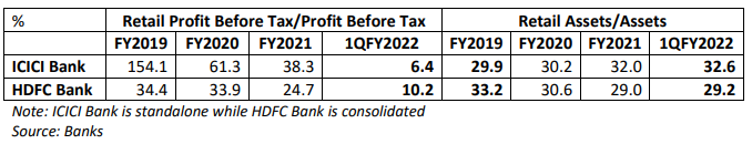 EXECUTIVE SUMMARY. ICICI Bank’s 1QFY2022 results on July 24, 2021 highlight the need for shareholders to re-examine the bank’s retail asset strategy. ICICI Bank’s strategy was to focus on retail assets to compensate for the bulky poor-quality corporate assets that it had earlier emphasised. However, the broad economic slowdown even prior to the Covid-19 pandemic impacted all segments of the economy, and the pandemic dealt small and medium enterprises, and indeed the whole informal sector, a severe blow. A section of organised sector employees too lost their jobs or experienced pay cuts. All these developments affected retail assets of banks. Unlike HDFC Bank, which started shifting from retail assets, ICICI Bank surged ahead in retail lending even when retail asset profits declined in FY2021, and this strategy continued in 1QFY2022 despite a drastic fall in retail profits.