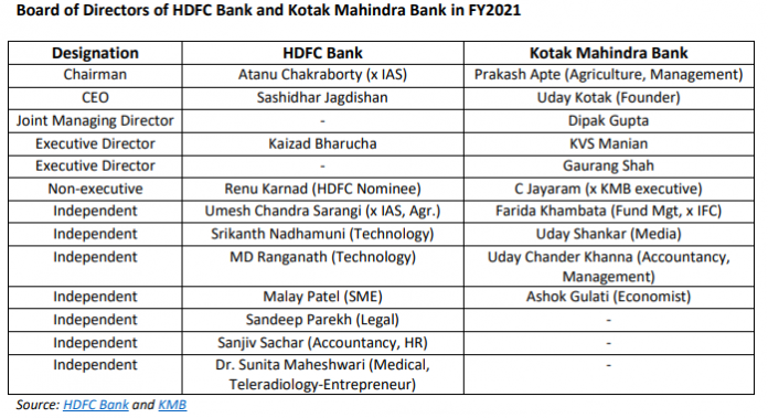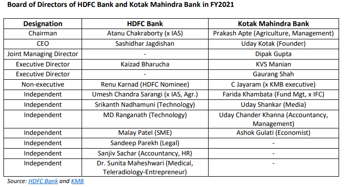 EXECUTIVE SUMMARY. A notable feature in HDFC Bank and Kotak Mahindra Bank (KMB) is the historical absence of any commercial banking expertise amongst the independent directors on the boards. The founders (HDFC and Uday Kotak) and the Nomination and Remuneration Committee in both banks, as a deliberate strategy, have tried to ensure that only non-independent directors have commercial banking expertise. This is unusual, as other private sector banks such as ICICI Bank, Axis Bank, Indusind Bank and Federal Bank have former commercial bankers as independent directors on their boards.