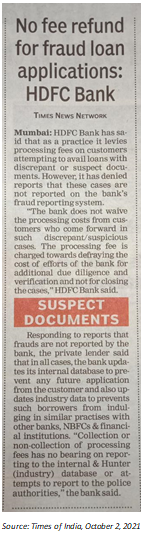 EXECUTIVE SUMMARY. This analyst’s research note on September 24, 2021 highlighted HDFC Bank’s disturbing practice of extracting ‘processing fees’ from prospective customers who applied for loans using false/fabricated documents. Following this, the media finally woke up (here and here) from their self-induced slumber. HDFC Bank was forced to issue a media statement  on October 1, 2021 wherein it justified levying processing fees, citing the additional due diligence required when loan applicants submitted “discrepant/suspected documents”. HDFC Bank also claimed that the bank filed police complaints in a “number of cases” where the processing cost was levied.  The bank also explicitly stated that the fees were not for closing the case.