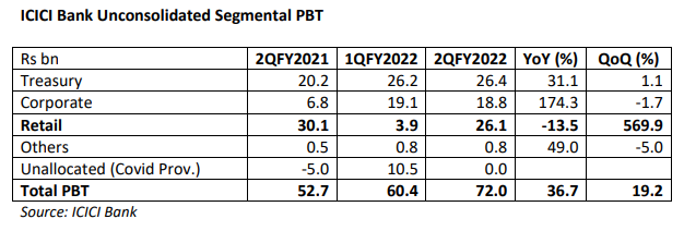 In 2QFY2022 ICICI Bank reported a YoY decline in retail Profit Before Tax (PBT) of 13.5% to Rs 26.1 bn (in 1QFY2022 Rs 3.9 bn), with retail loans of Rs 4,404 bn. Pertinently, the retail PBT in 1QFY2021 was Rs 27.6 bn with retail loans of Rs 3,449 bn. Even though retail loans since 1QFY2021 increased by 28%, the retail PBT in 2QFY2022 is still below the level of 1QFY2021. The bank’s overall domestic net interest margin in 2QFY2022 is higher than 1QFY2021 and 2QFY2021, which indicates that the performance was not impacted by a squeeze in margins but more likely by credit costs.