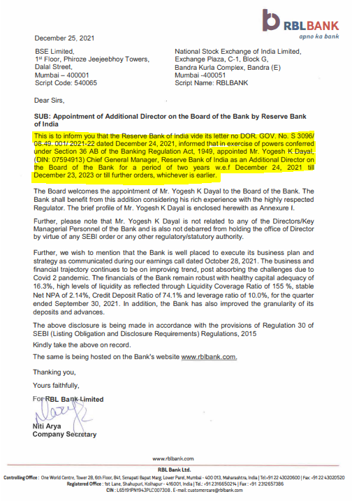 EXECUTIVE SUMMARY. Xmas festivities were disrupted when RBL Bank dropped a bombshell on the stock exchanges. It informed the public that the Reserve Bank of India (RBI), under Section 36AB of the Banking Regulation Act, 1949, had appointed Yogesh K Dayal (Chief General Manager, RBI) as an additional director. Four and a half hours after this announcement came even more worrying news: the board had accepted the request of Vishwavir Ahuja (CEO since June 30, 2010) to proceed on leave with immediate effect, and had appointed Rajeev Ahuja (currently Executive Director) as the interim CEO.
