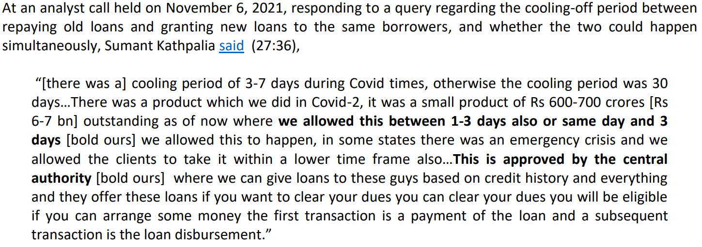 Intriguingly, on November 6, 2021, Sumant Kathpalia, CEO Indusind Bank, on an analyst call stated that the bank had an approved product during Covid-2, whereby the cooling period between repayment of earlier loans and the disbursal of new loans to the same customers was reduced from 30 days to within the “same day and three days”. The revised policy was fraught with risk. The bank claimed it was concerned to ensure that the repayment of the earlier loan should precede the disbursal of the new loan. But when the policy apparently permitted both transactions to take place within the same day, and also allowed for the transactions to be done in cash, it eventually led to a situation where the bank was unable to determine the timing of the repayment of the old loan and the disbursal of the new loan. In other words, borrowers may have funded their repayment with a fresh loan from the bank. The “procedural lapse” was therefore the direct result of a product approved by the risk management committee of the bank.
