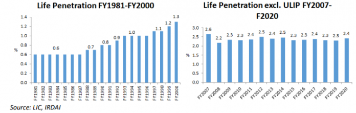 EXECUTIVE SUMMARY. The argument made at the time of opening up the life insurance sector and allowing the private sector was that doing so would increase life insurance penetration (life premium/GDP) and thereby increase long term savings, which would flow into infrastructure investments (which are inherently long-term). But despite the entry of 23 private companies, from FY2007 till FY2020 life penetration (excluding ULIPs) has stagnated. The theory that permitting the private sector to enter life insurance will increase penetration has been disproved in the 2 decades since 2000.