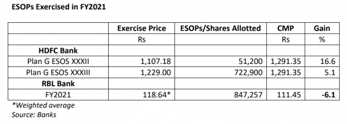 All the ESOPs granted to senior executives in RBL Bank and nearly all in Bandhan Bank in FY2021 are under water at current market prices.