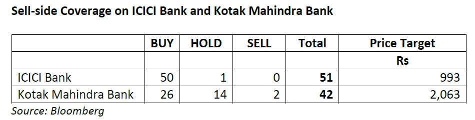 According to Bloomberg, both ICICI Bank and Kotak Mahindra Bank (KMB) are actively covered by sell-side analysts: the former is tracked by 51 analysts, while the latter is covered by 42 analysts. By contrast, JP Morgan Chase, the largest US bank by market capitalisation, is covered by only 24 analysts.