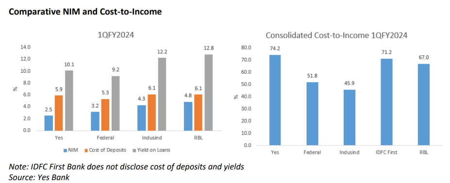 Yes Bank is expected to remain dependent on its corporate division to drive its profits even as it invests in its retail strategy. A worrying concern is that the bank is unable to significantly attract retail liabilities which indicates more expenditure on marketing/branding to reassure the retail public. In its 1QFY2024 results call, Yes Bank stated that its marketing/advertisement expenses would rise by 25% in FY2024 for its rebranding exercise. While retail deposits may take time, the bank is compelled to continue to attract corporate deposits at higher interest rates, thereby keeping its cost of funds elevated. With Yes Bank unwilling to inflict deep pain by reducing staff, the bank will have to maintain a high cost of banking operations. As its corporate division is currently conservatively growing loans, the spreads on the corporate loans is likely to be slim, and the only option for increasing yields is to venture into high yield retail loans such as credit cards, vehicle finance and micro finance. There have been media reports that the bank is planning to acquire a micro finance company. Even if the bank acquires a micro finance company, it may take some time for it to have a meaningful impact on its yield on loans and its NIM.